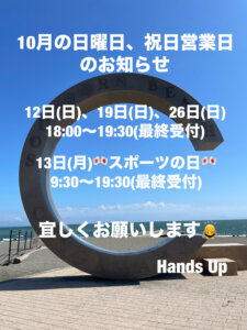 21日(日)と15日(月)敬老の日、23日(火)秋分の日を通常通り(9:30~19:30最終受付)営業します。ご都合のつく方、是非ご予約ください。