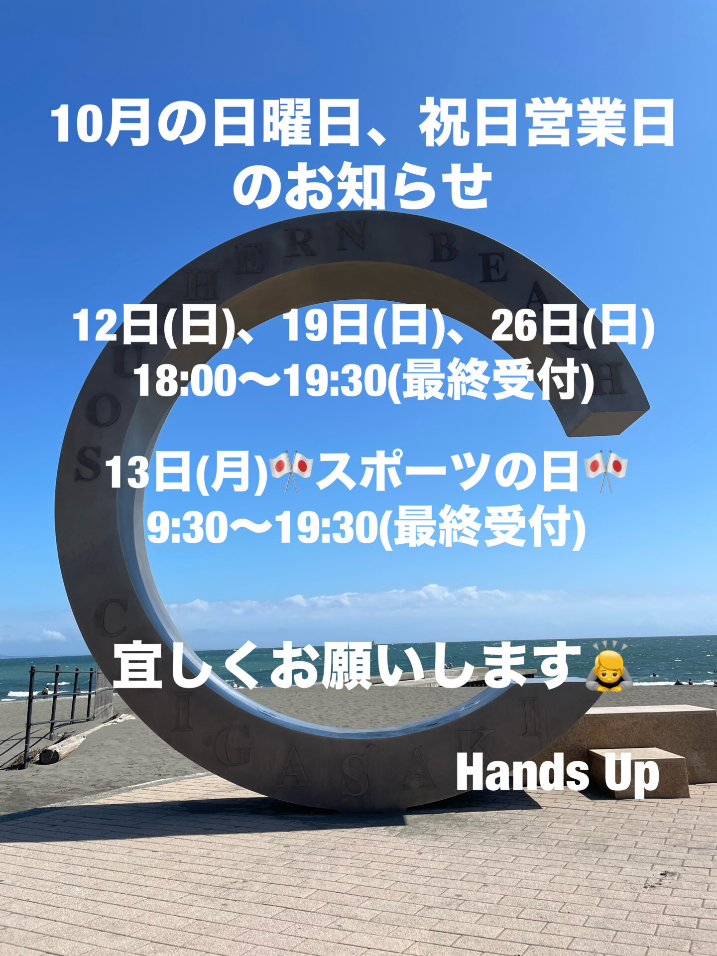 13日(月)スポーツの日は通常通り(9:30~19:30最終受付)営業します。ご都合のつく方、是非ご予約ください。
