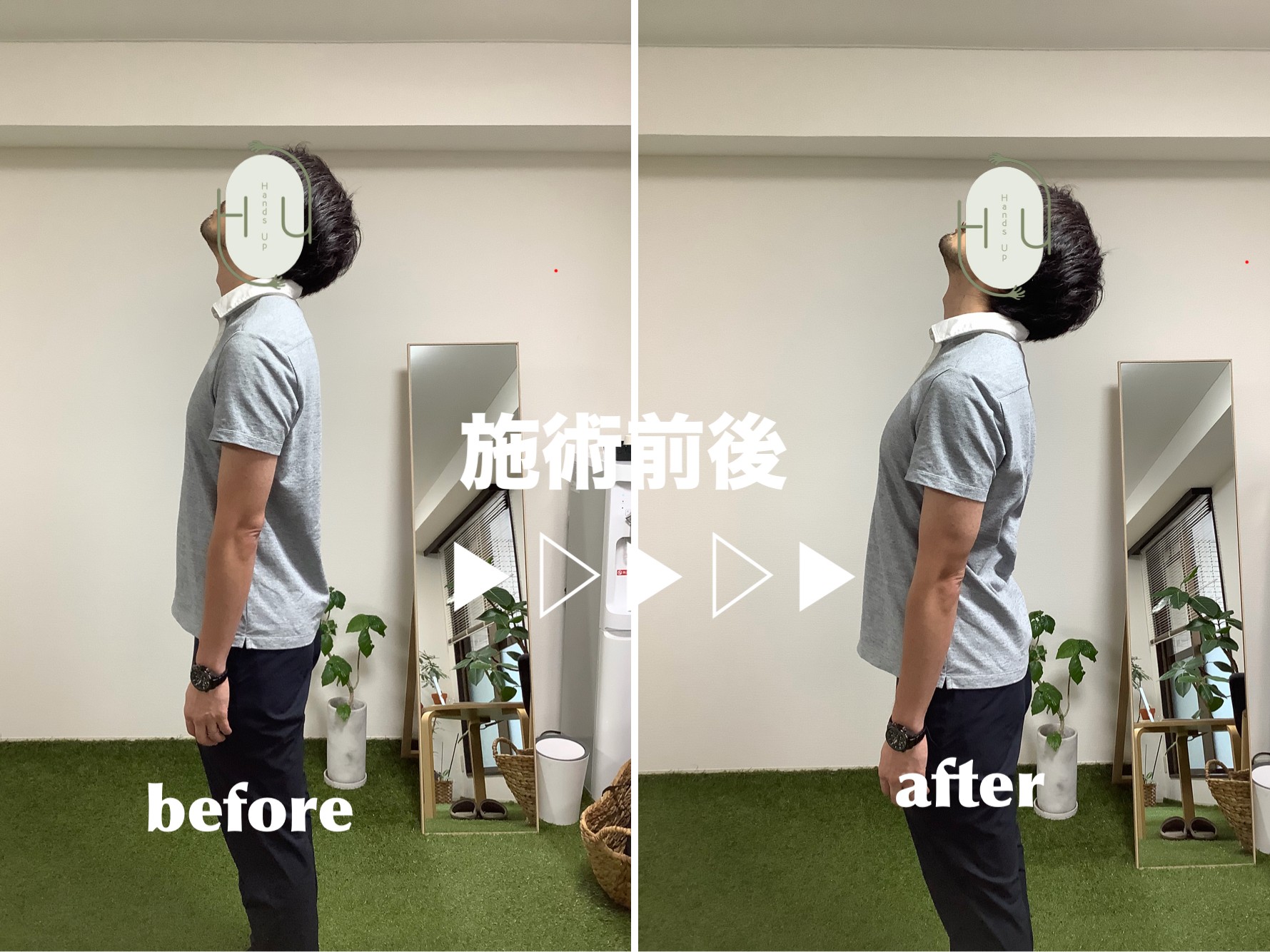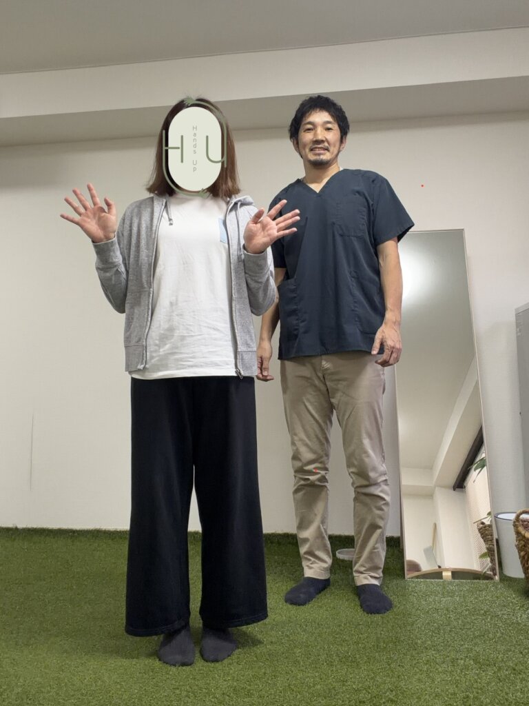 ストレートネック、巻き肩、腰痛で悩んでいたのと、結婚式までに綺麗な姿勢になりたいと思って伺いました。反り腰が改善して姿勢が良くなりました。式前の準備で何が一番良かったかと聞かれたら、「Hands Upに行ったこと」と答えるくらい姿勢が変わっていました。腰痛も以前のように出ていません。(20代 女性)